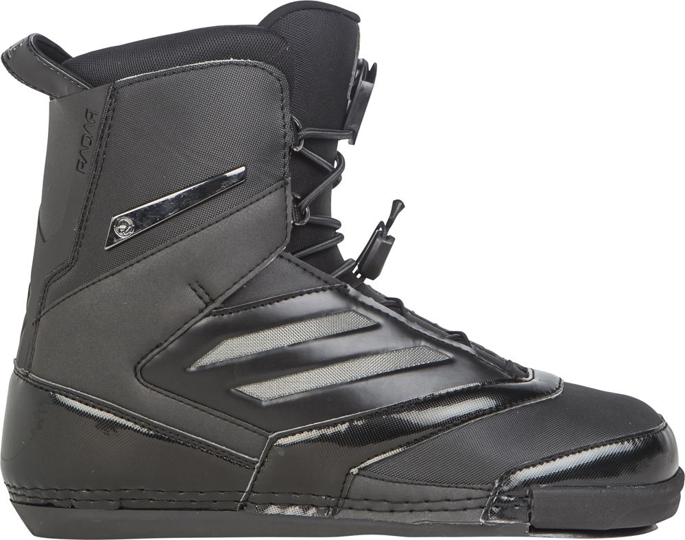 Slalom ski boots are available in two key styles; Open-toe or closed-toe. Majority of modern slalom skis use a ‘traditional’ mountain pattern allowing different brands of boot to be fitted onto any given ski. 2017 and earlier HO skis with D.C. (Direct connect) inserts must be mounted with HO D.C. style front and rear boots. Those wishing to mount Radar boots to their 2018 and later HO ski must use an aluminium rear plate. BOA slalom ski boot variants replace traditional lower laces with a BOA lacing system for fast, efficient closure.