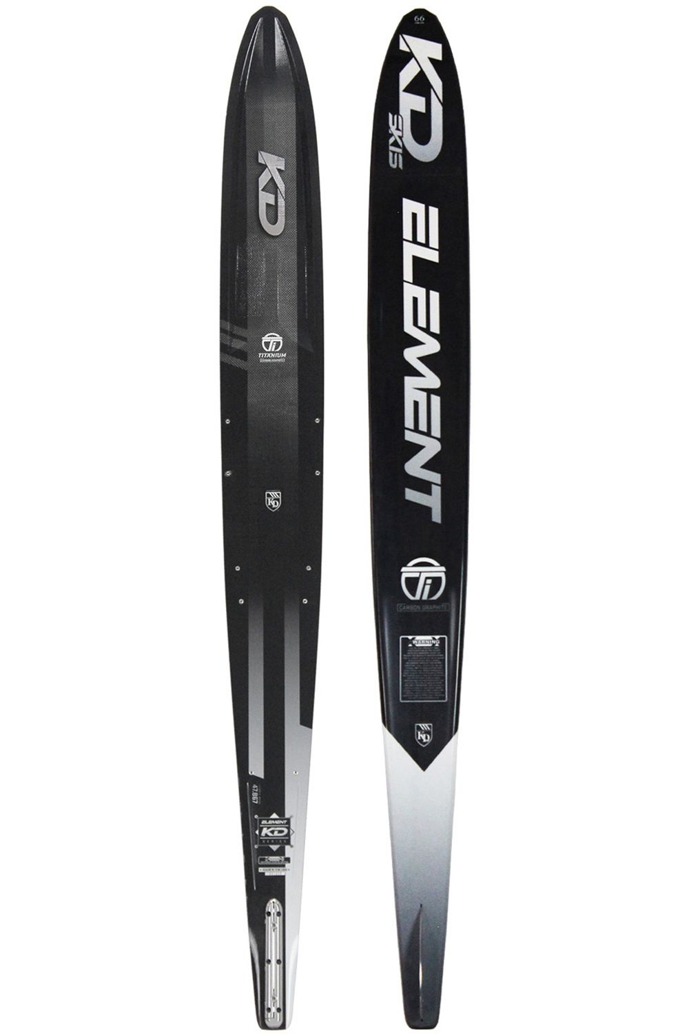 In development for over 2yrs this USA made ski is loaded with features to deliver performance set after set! The all new Titanium tops of the Element series and is loaded with features and performance. We started with our world class Platinum and increased the flat spot under the bindings, thus adding stability and speed. We moved the tip riser step in the front of the concave towards the tip of the ski to allow the concave to disperse the water a little further forward during the turn whilst still helping raise the tip of the ski should the skiers feel that stalling feeling. The inside edge of the tail bevel has been rounded to allow the ski to roll through the turn a little more smoothly, especially on the gate turn.
