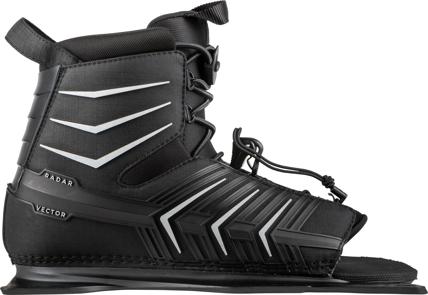Slalom ski boots are available in two key styles; Open-toe or closed-toe. Majority of modern slalom skis use a ‘traditional’ mountain pattern allowing different brands of boot to be fitted onto any given ski. 2017 and earlier HO skis with D.C. (Direct connect) inserts must be mounted with HO D.C. style front and rear boots. Those wishing to mount Radar boots to their 2018 and later HO ski must use an aluminium rear plate. BOA slalom ski boot variants replace traditional lower laces with a BOA lacing system for fast, efficient closure.