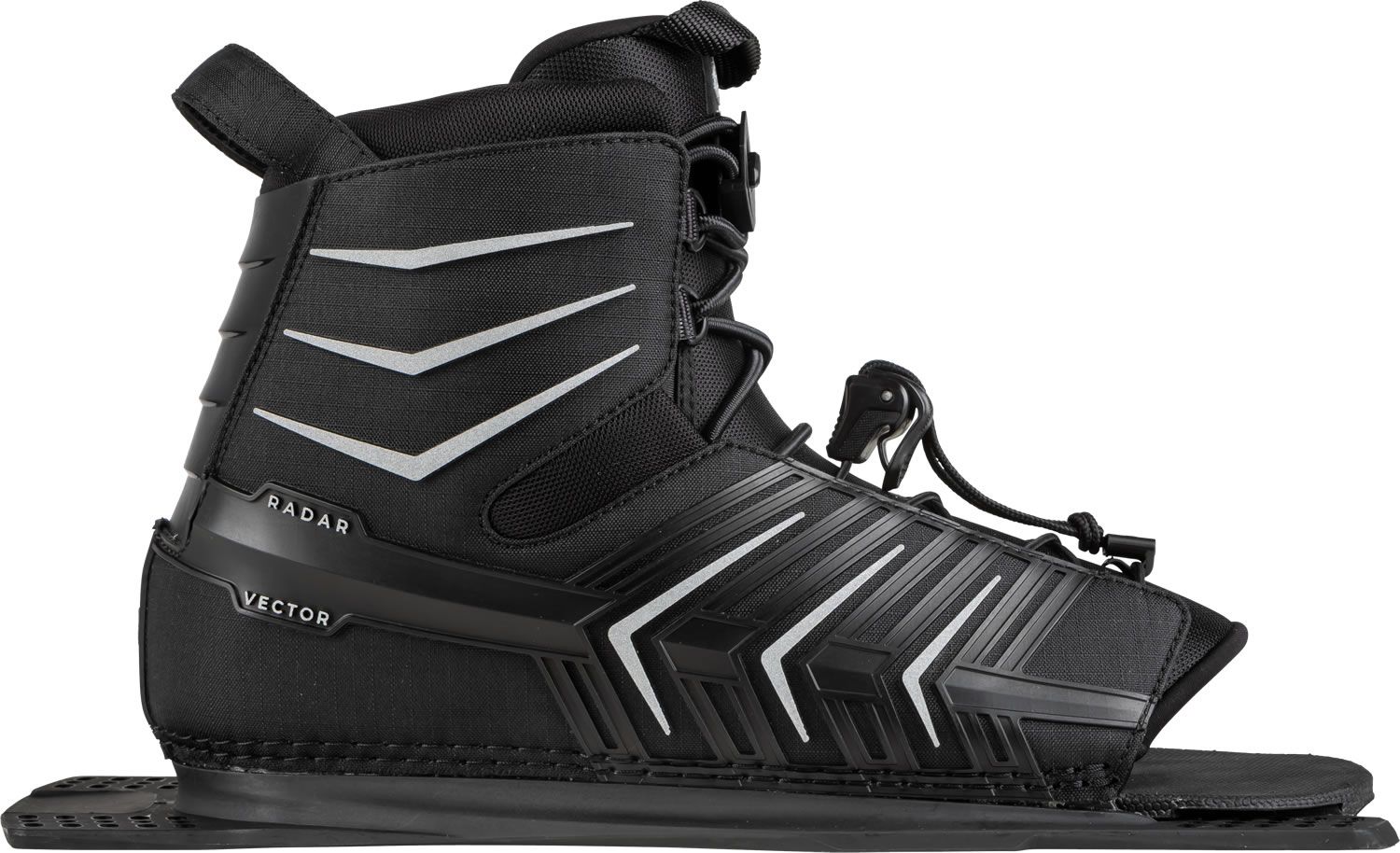 Slalom ski boots are available in two key styles; Open-toe or closed-toe. Majority of modern slalom skis use a ‘traditional’ mountain pattern allowing different brands of boot to be fitted onto any given ski. 2017 and earlier HO skis with D.C. (Direct connect) inserts must be mounted with HO D.C. style front and rear boots. Those wishing to mount Radar boots to their 2018 and later HO ski must use an aluminium rear plate. BOA slalom ski boot variants replace traditional lower laces with a BOA lacing system for fast, efficient closure.