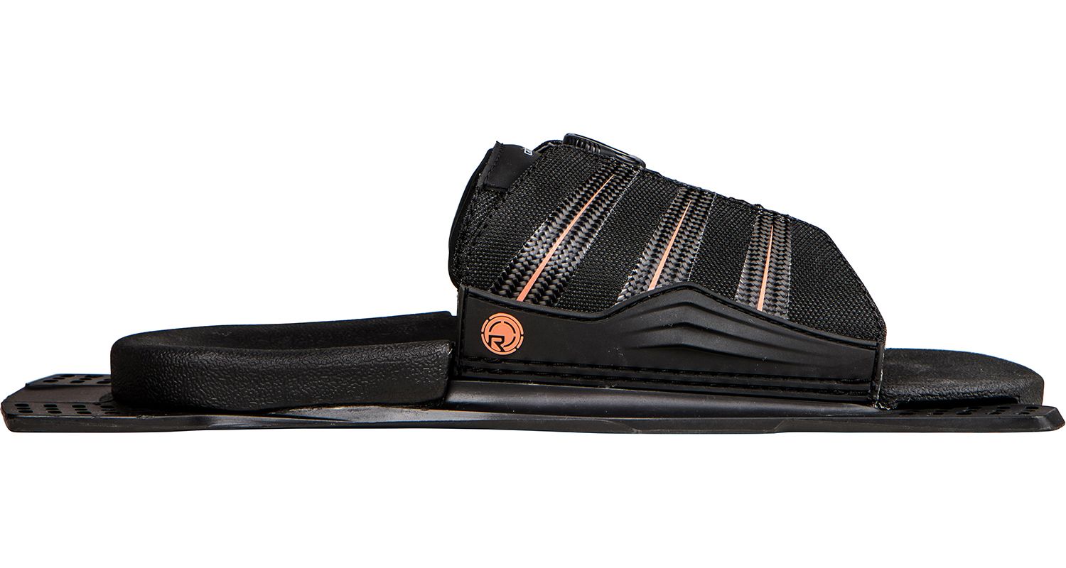 - REAR TOE PLATES: Rear toe plates are available in adjustable or fixed styles. Adjustable RTP’s are one-size-fits-all and feature a lace or BOA system to cater for all foot sizes up to US 14. Fixed RTP’s are made of rubber and are available in specific US shoe sizes with aluminium plates. Hybrid rear toe plates (HRT’s) combine the ankle support of a full boot with the flexibility of a RTP. HRTs are best for skiers who deep water starts with two feet in and are looking to bridge the gap between a full boot and traditional RTP.