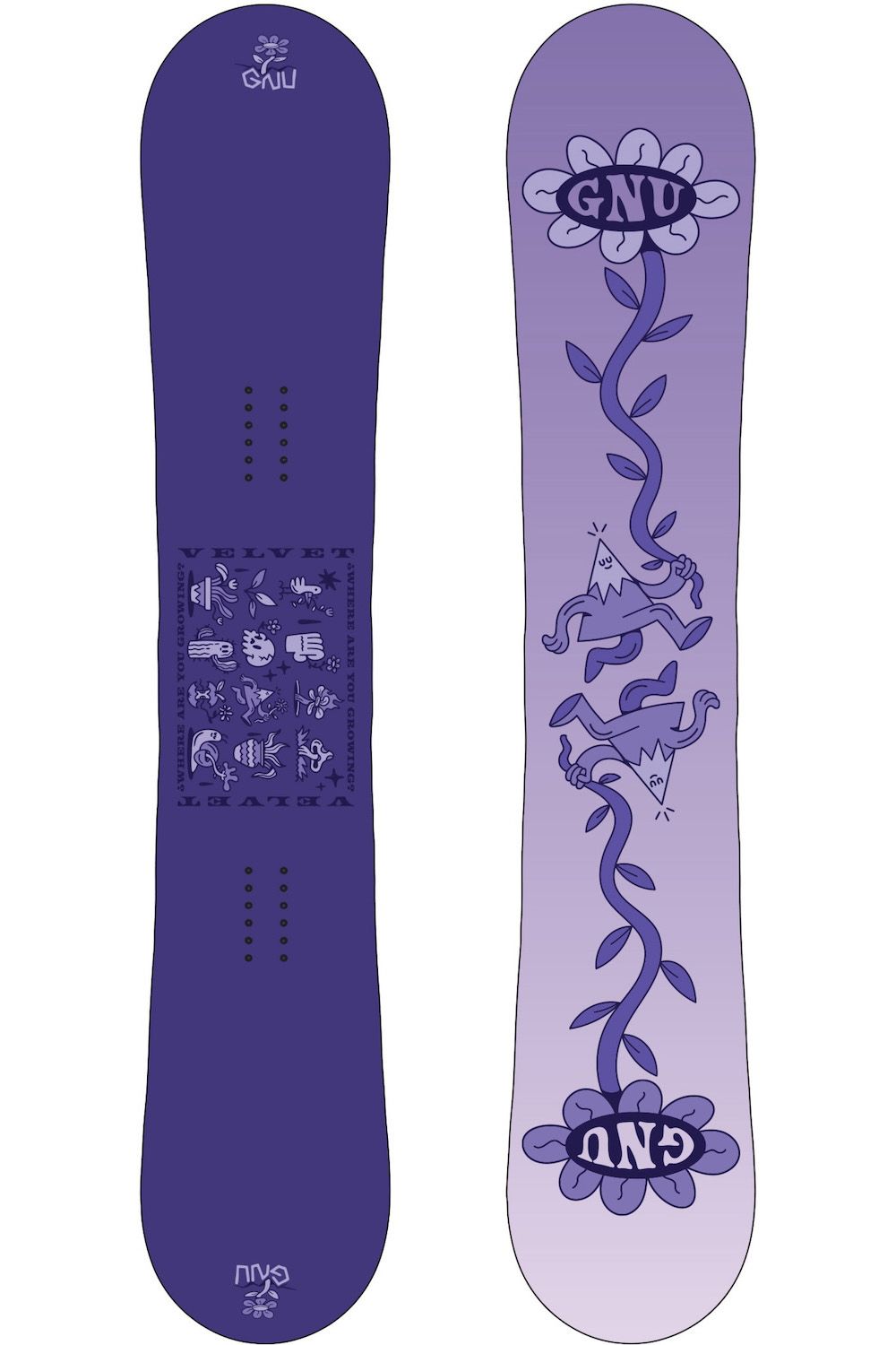 The Velvet is the choice of Gnu team riders who approach the whole mountain like their park. It’s snappy flex and hybrid C2 contour work in synergy for pop and stability. It features intuitive asym geometry, and Magne-Traction®, so it is catch-free and responsive. The eco sublimated plant-based graphics give this ride a down to earth vibe. The Velvet is comfortable in any conditions and as balanced in the park as it is in banked slaloms or street sessions. Design conceptualized by Naima Antolin and designed by Hannah Eddy.