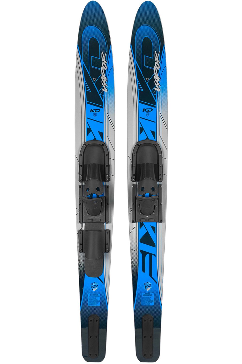 Combo skis are designed for beginners and come in pairs with a front boot on each and a rear toe plate on one, giving the skier the ability to drop a ski and slalom. Most combo skis include traditional adjustable horse-shoe style binding systems however premium models feature a supportive, comfortable boot system. While nearly all adult combo’s include inserts for a trainer bar to be added later, kid’s trainers come with the trainer bar, rope and handle included. Combo skis are available in varying widths of narrow and wide. Wide combos with more surface area will provide easier deep water starts and more straight-line stability once up. Narrow combo’s will be nimbler once skiing.