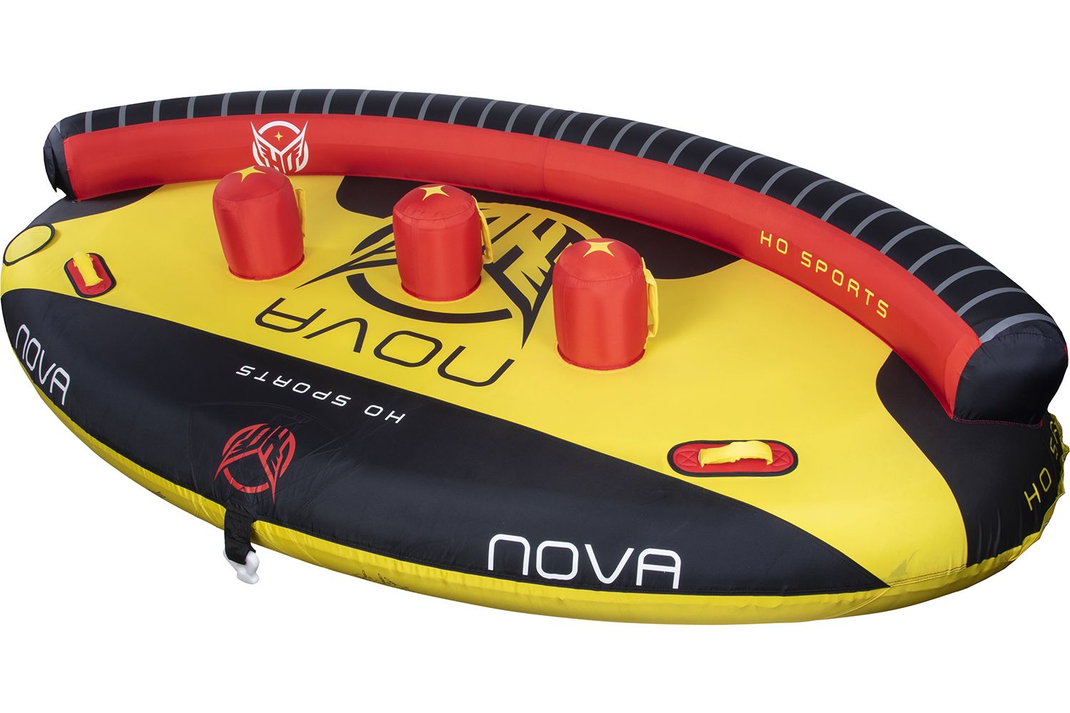 Experience a new way of tubing with the Nova Tube series from HO Sports. The 3 rider Nova 3 or 4 rider Nova 4 are the latest creation in towable tubes from the minds at HO Sports. This unique tube shape offers strategically angled seats for optimum rider placement. It’s got comfortable padded seats, separated by air-filled rider dividers with grab handles. The soft foam handles on deck are equipped with padded knuckle guards for when things get wild! The curved, ergonomic seat back gives you a different ride depending on the spot you pick.