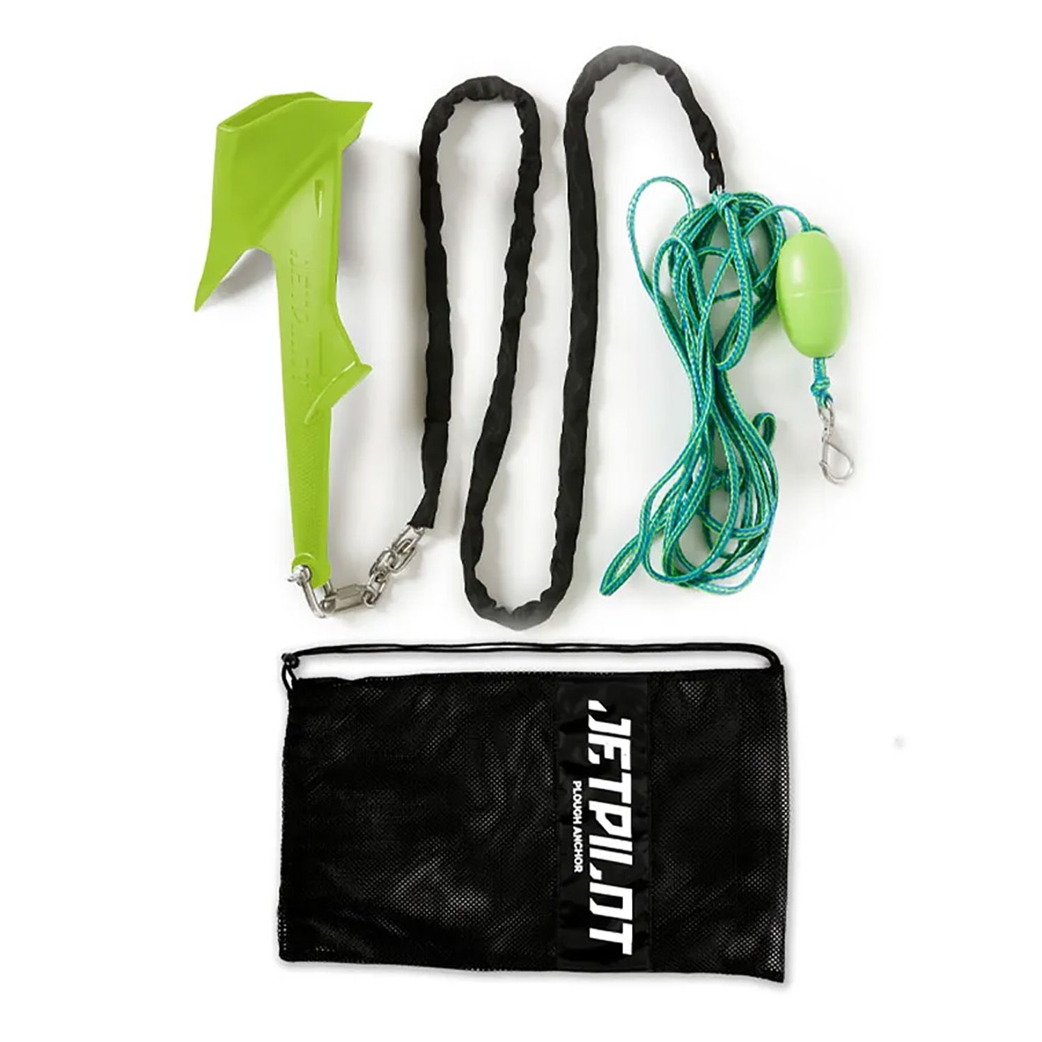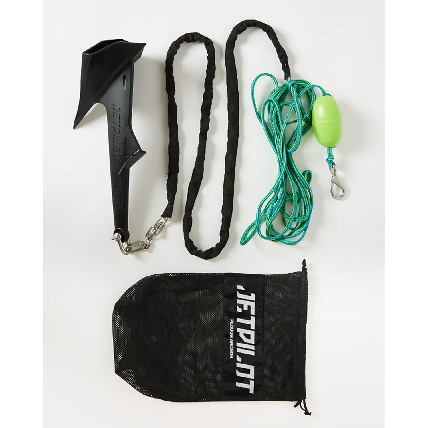 Experience the ultimate anchoring solution with the Jetpilot Plough Anchor, designed to ensure secure and strong hold in any water depth. Featuring a lead self-locating tip and a wide sand scoop for extra anchoring, the set includes 2m stainless steel chain, 6m marine grade poly rope with 3 adjustable loops, a hi-vis float and a durable snap hook all stored neatly in a mesh bag. An ideal all-round anchor!