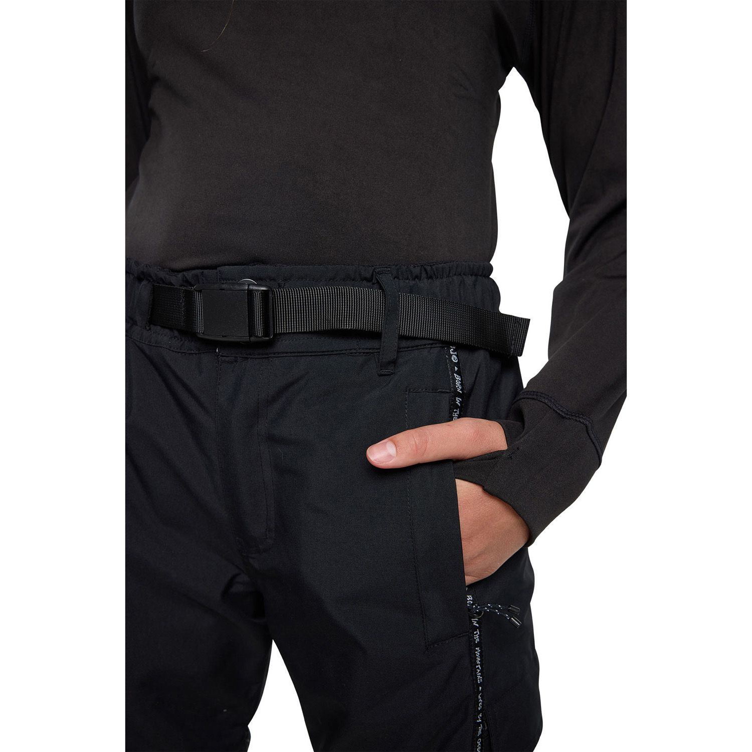 - WATERPROOFING: Refers to the ability of the pants to prevent water from penetrating through the fabric and getting to your skin or base layers. Snow pants are typically made of materials and textiles that have been engineered to be highly resistant to water. The waterproofing ability of snow pants is typically measured in millimetres and is referred to as the "waterproof rating." This rating tells you how much water pressure the fabric can withstand before it starts to leak. For example, pants with a 10,000mm waterproof rating means it can withstand 10,000mm of water pressure before it starts to leak. A 10,000mm rating is a suitable standard for snow pants, while pants with a rating of 20,000mm or 30,000mm are extremely waterproof. Pants with a high waterproof rating will help to keep you dry and comfortable while you are skiing or snowboarding. In addition to the waterproof rating, snow pants may also have additional waterproofing features like taped seams, waterproof zippers, and water-resistant coatings such as DWR that help to enhance the pants ability to repel water.