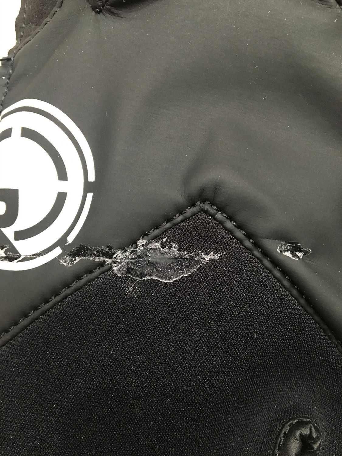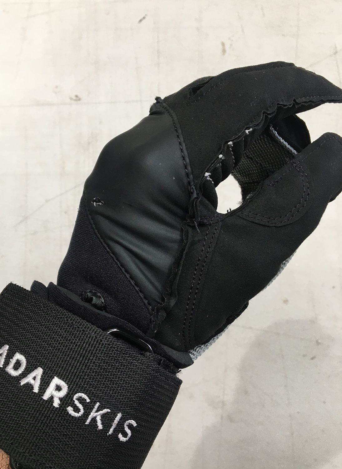 2024 Radar Vice Gloves - damaged. These gloves are new, but one was accidentally nicked by a blade (not all the way through) and repaired. Should last like a new pair, just have a noticeable repair.