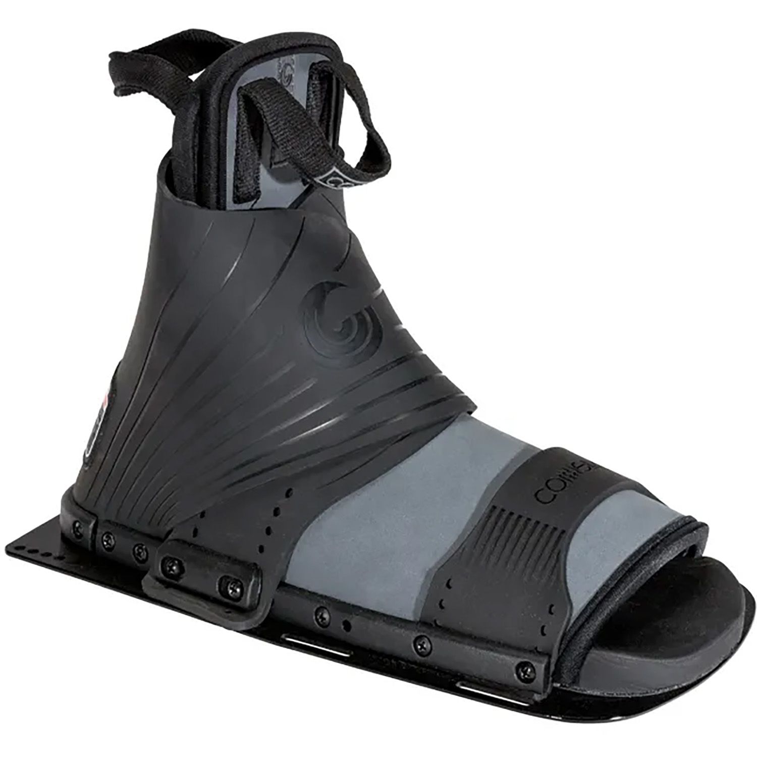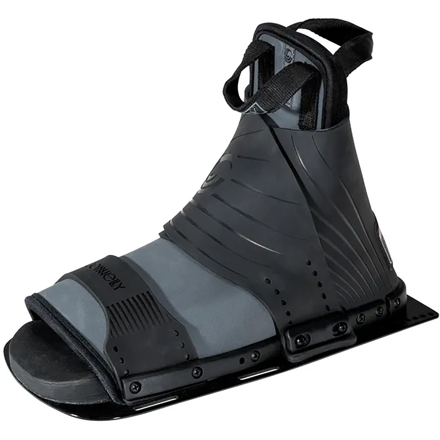 - REAR TOE PLATES: Rear toe plates are available in adjustable or fixed styles. Adjustable RTP’s are one-size-fits-all and feature a lace or BOA system to cater for all foot sizes up to US 14. Fixed RTP’s are made of rubber and are available in specific US shoe sizes with aluminium plates. Hybrid rear toe plates (HRT’s) combine the ankle support of a full boot with the flexibility of a RTP. HRTs are best for skiers who deep water starts with two feet in and are looking to bridge the gap between a full boot and traditional RTP.