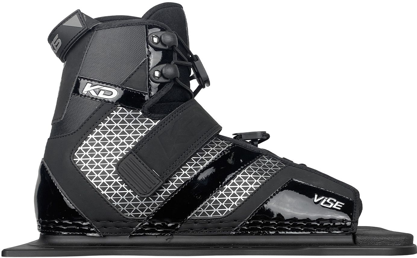 - REAR TOE PLATES: Rear toe plates are available in adjustable or fixed styles. Adjustable RTP’s are one-size-fits-all and feature a lace or BOA system to cater for all foot sizes up to US 14. Fixed RTP’s are made of rubber and are available in specific US shoe sizes with aluminium plates. Hybrid rear toe plates (HRT’s) combine the ankle support of a full boot with the flexibility of a RTP. HRTs are best for skiers who deep water starts with two feet in and are looking to bridge the gap between a full boot and traditional RTP.