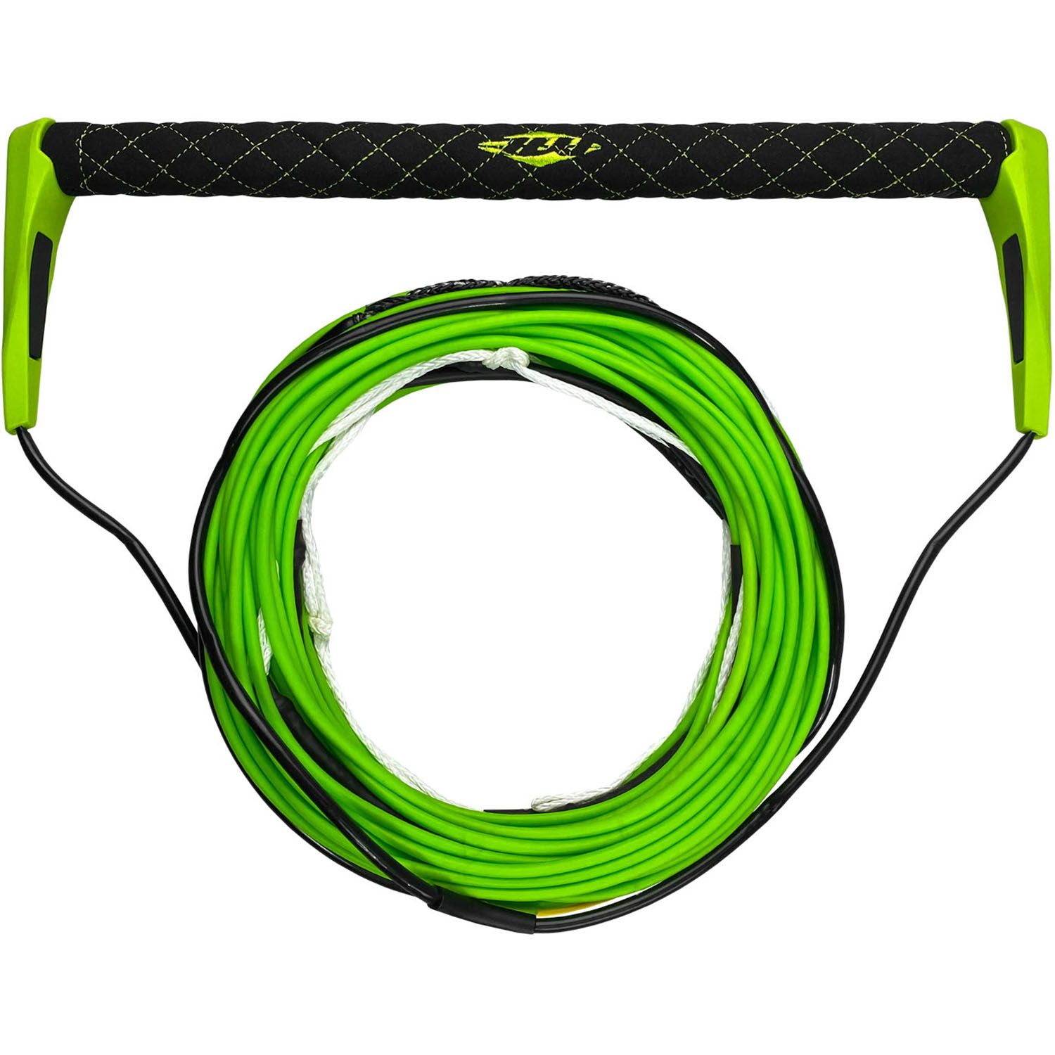 Wakeboard handles come in 15” widths for a wide, stable grip with various handle shapes, diameters and materials aimed to satisfy rider preferences. Premium handles become lighter and stronger and often have unique textures for added grip. Some handles include T-bars designed for advanced riders pre-wrapping spin tricks.