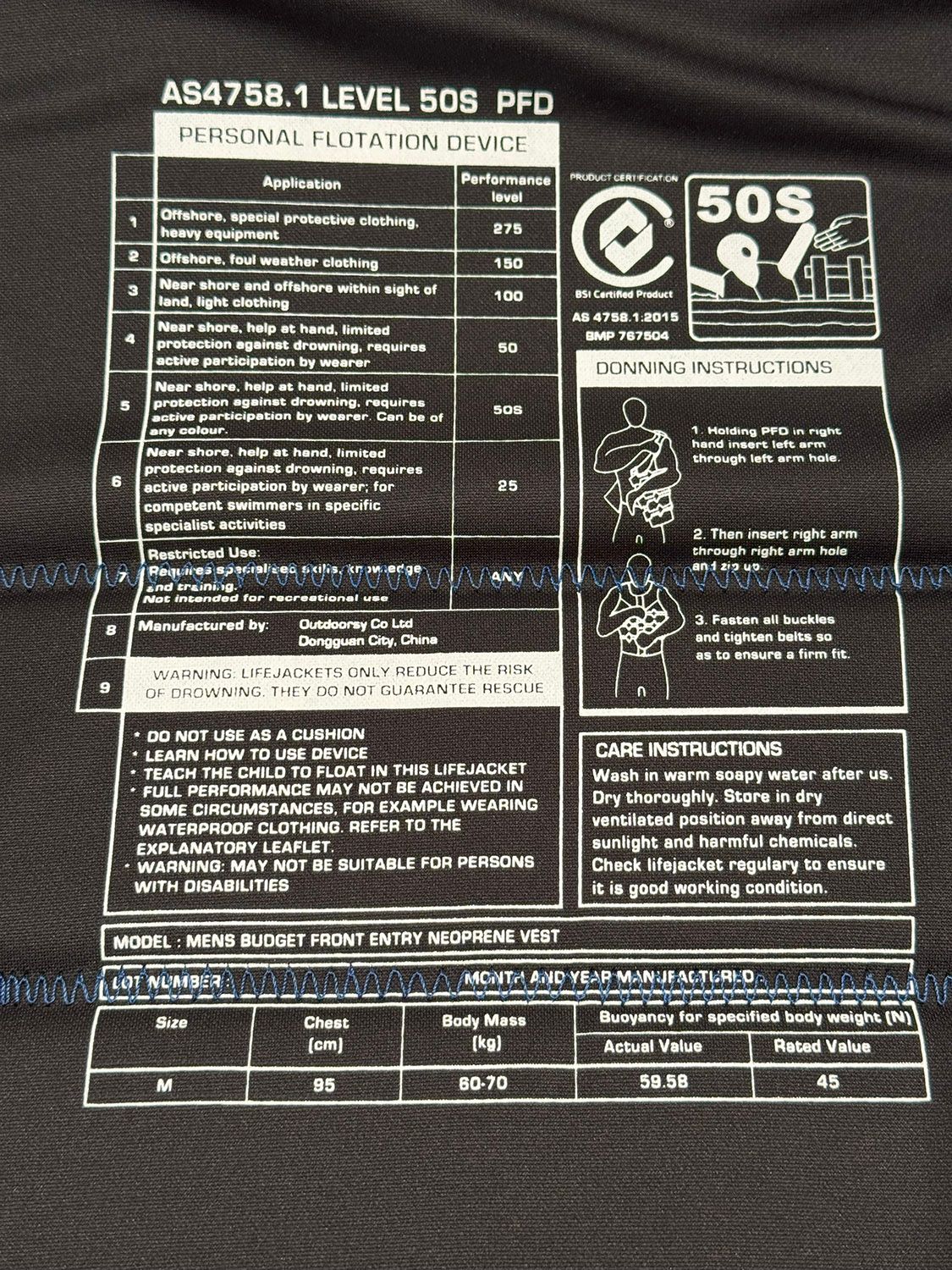 There is NO LOT NUMBER on the Australian Standards PFD/L50S stamp inside the vest, meaning this Vest is NOT APPROVED as a personal flotation device. So, we must work in the parameter that it may NOT be the same as an APPROVED Vest.