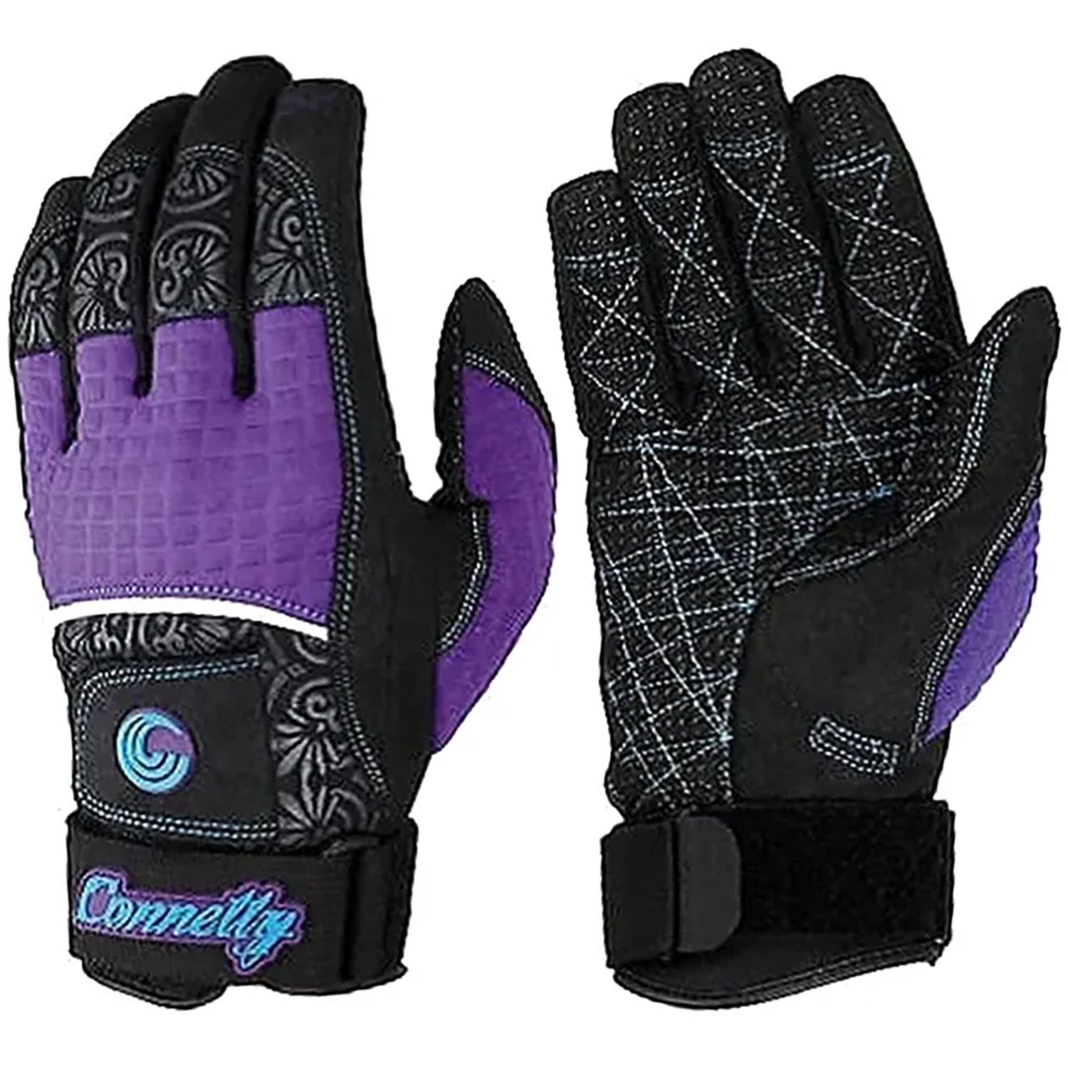 The Connelly SP Waterski Gloves are full-fingered, high-end gloves with the same popular features as the men's tournament gloves. They've been reworked and sized specifically for a woman's hand. Amara palm with sticky bumps offer increased grip. Pre-curved fingers form perfectly to hands, and the Velcro back hand closure gives you all the adjustment you need.