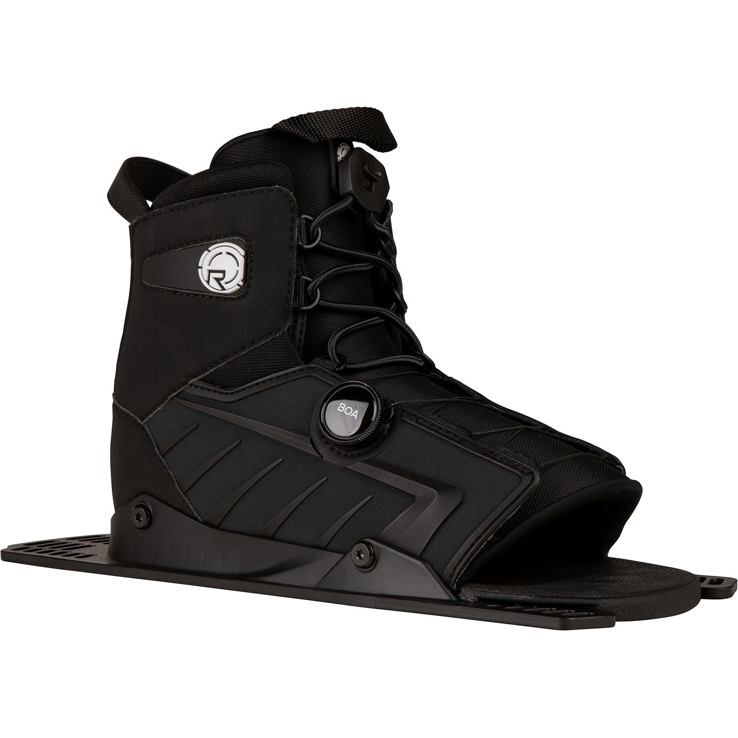 - REAR TOE PLATES: Rear toe plates are available in adjustable or fixed styles. Adjustable RTP’s are one-size-fits-all and feature a lace or BOA system to cater for all foot sizes up to US 14. Fixed RTP’s are made of rubber and are available in specific US shoe sizes with aluminium plates. Hybrid rear toe plates (HRT’s) combine the ankle support of a full boot with the flexibility of a RTP. HRTs are best for skiers who deep water starts with two feet in and are looking to bridge the gap between a full boot and traditional RTP.