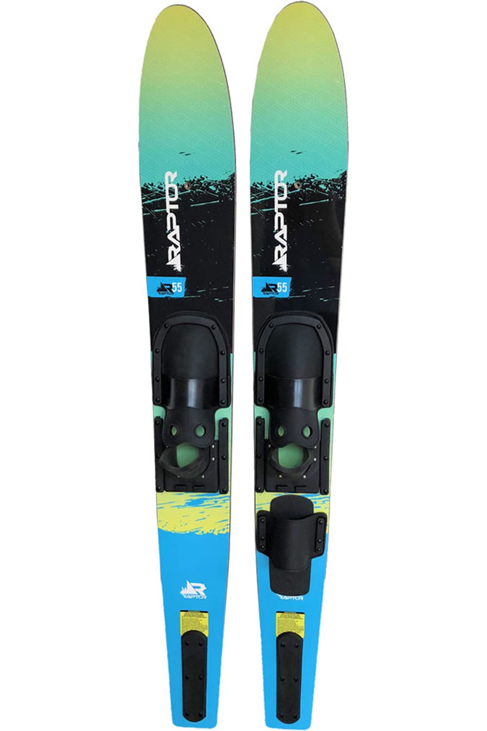 Combo skis are designed for beginners and come in pairs with a front boot on each and a rear toe plate on one, giving the skier the ability to drop a ski and slalom. Most combo skis include traditional adjustable horse-shoe style binding systems however premium models feature a supportive, comfortable boot system. While nearly all adult combo’s include inserts for a trainer bar to be added later, kid’s trainers come with the trainer bar, rope and handle included. Combo skis are available in varying widths of narrow and wide. Wide combos with more surface area will provide easier deep water starts and more straight-line stability once up. Narrow combo’s will be nimbler once skiing.
