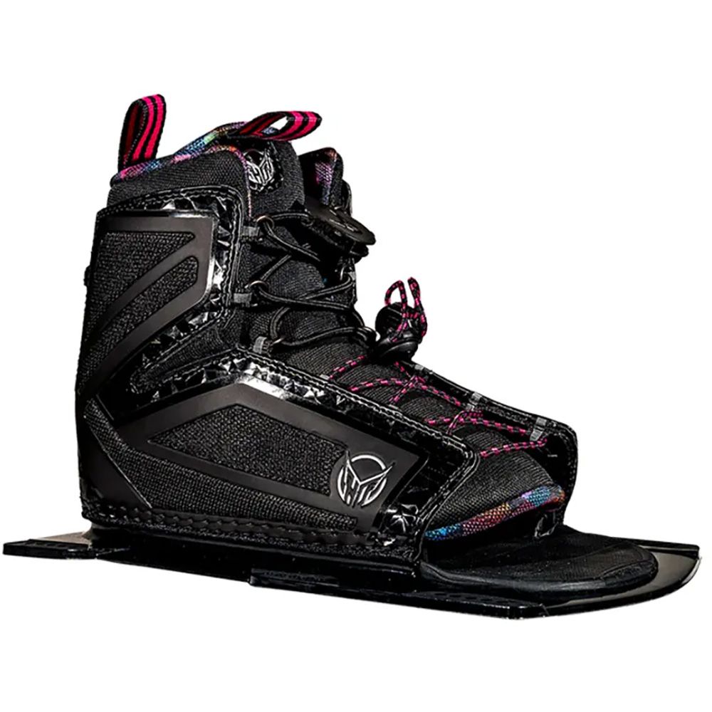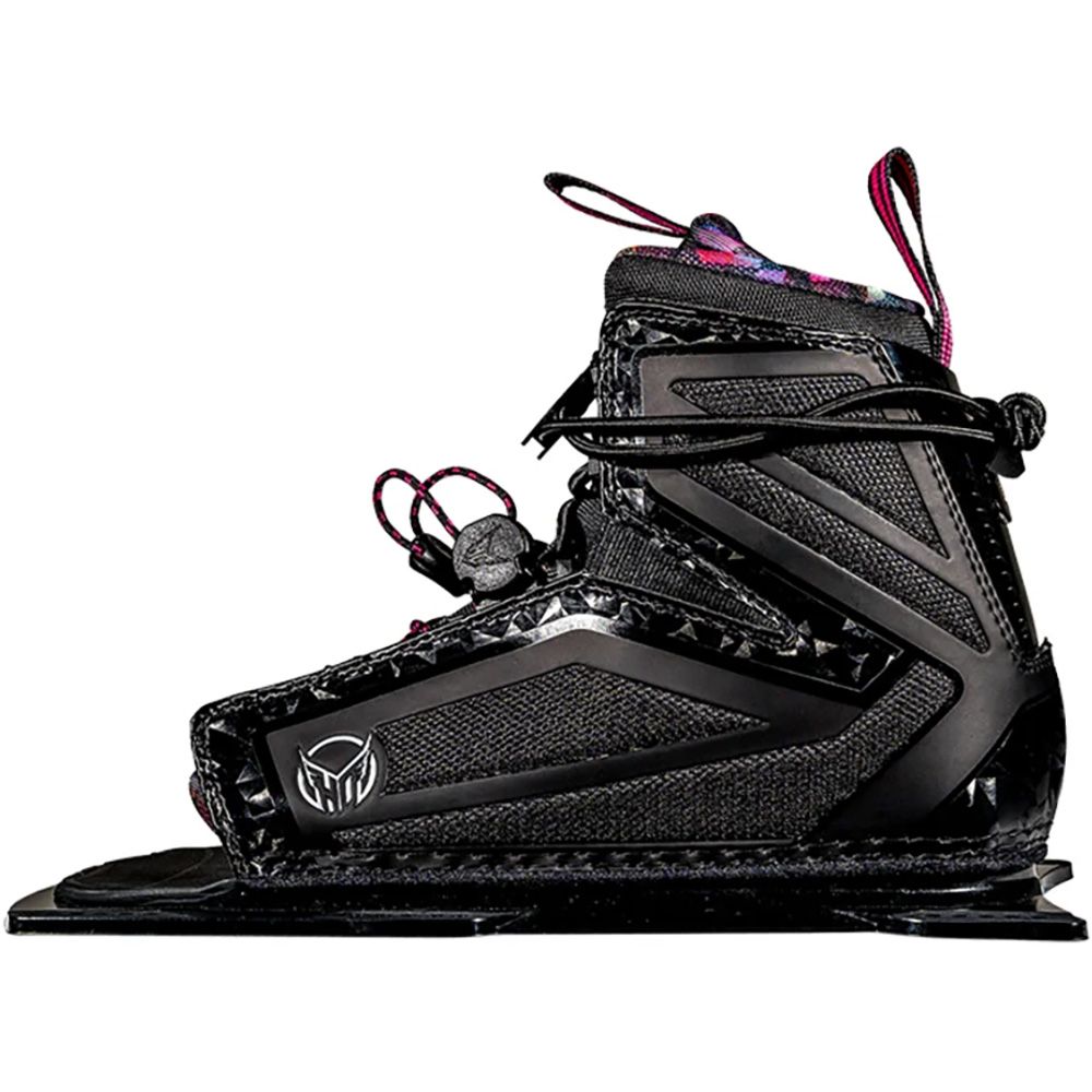 Slalom ski boots are available in two key styles; Open-toe or closed-toe. Majority of modern slalom skis use a ‘traditional’ mountain pattern allowing different brands of boot to be fitted onto any given ski. 2017 and earlier HO skis with D.C. (Direct connect) inserts must be mounted with HO D.C. style front and rear boots. Those wishing to mount Radar boots to their 2018 and later HO ski must use an aluminium rear plate. BOA slalom ski boot variants replace traditional lower laces with a BOA lacing system for fast, efficient closure.