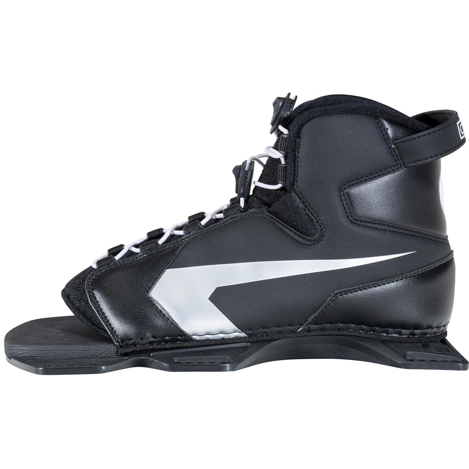 Slalom ski boots are available in two key styles; Open-toe or closed-toe. Majority of modern slalom skis use a ‘traditional’ mountain pattern allowing different brands of boot to be fitted onto any given ski. 2017 and earlier HO skis with D.C. (Direct connect) inserts must be mounted with HO D.C. style front and rear boots. Those wishing to mount Radar boots to their 2018 and later HO ski must use an aluminium rear plate. BOA slalom ski boot variants replace traditional lower laces with a BOA lacing system for fast, efficient closure.
