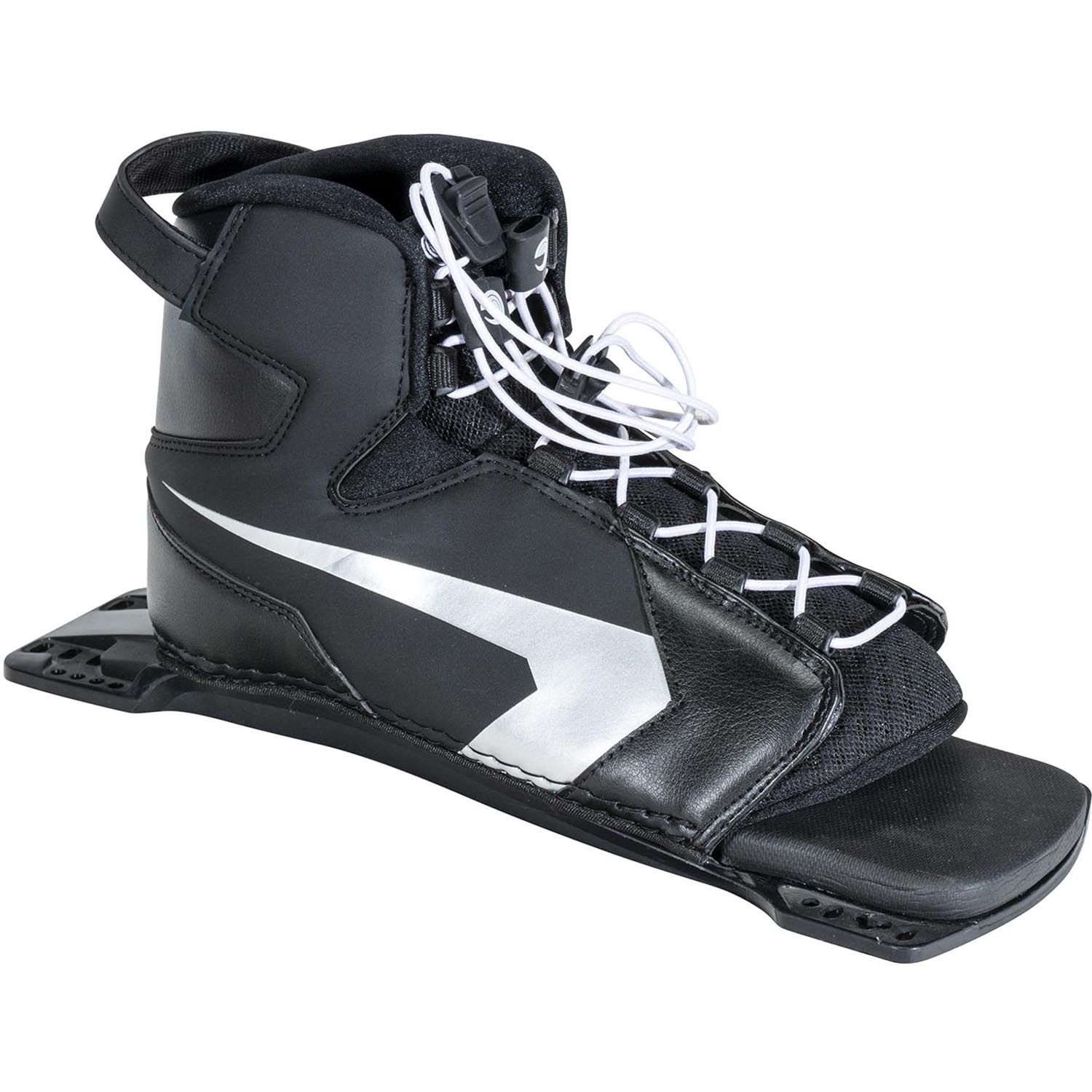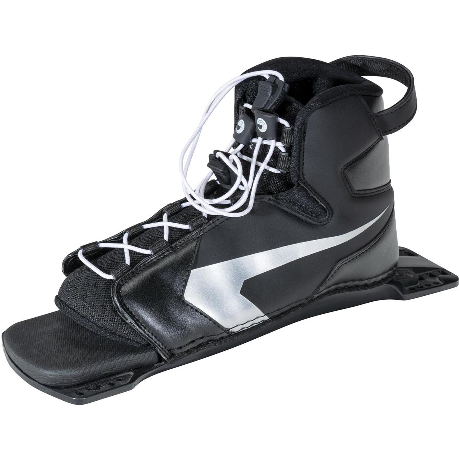 - REAR TOE PLATES: Rear toe plates are available in adjustable or fixed styles. Adjustable RTP’s are one-size-fits-all and feature a lace or BOA system to cater for all foot sizes up to US 14. Fixed RTP’s are made of rubber and are available in specific US shoe sizes with aluminium plates. Hybrid rear toe plates (HRT’s) combine the ankle support of a full boot with the flexibility of a RTP. HRTs are best for skiers who deep water starts with two feet in and are looking to bridge the gap between a full boot and traditional RTP.