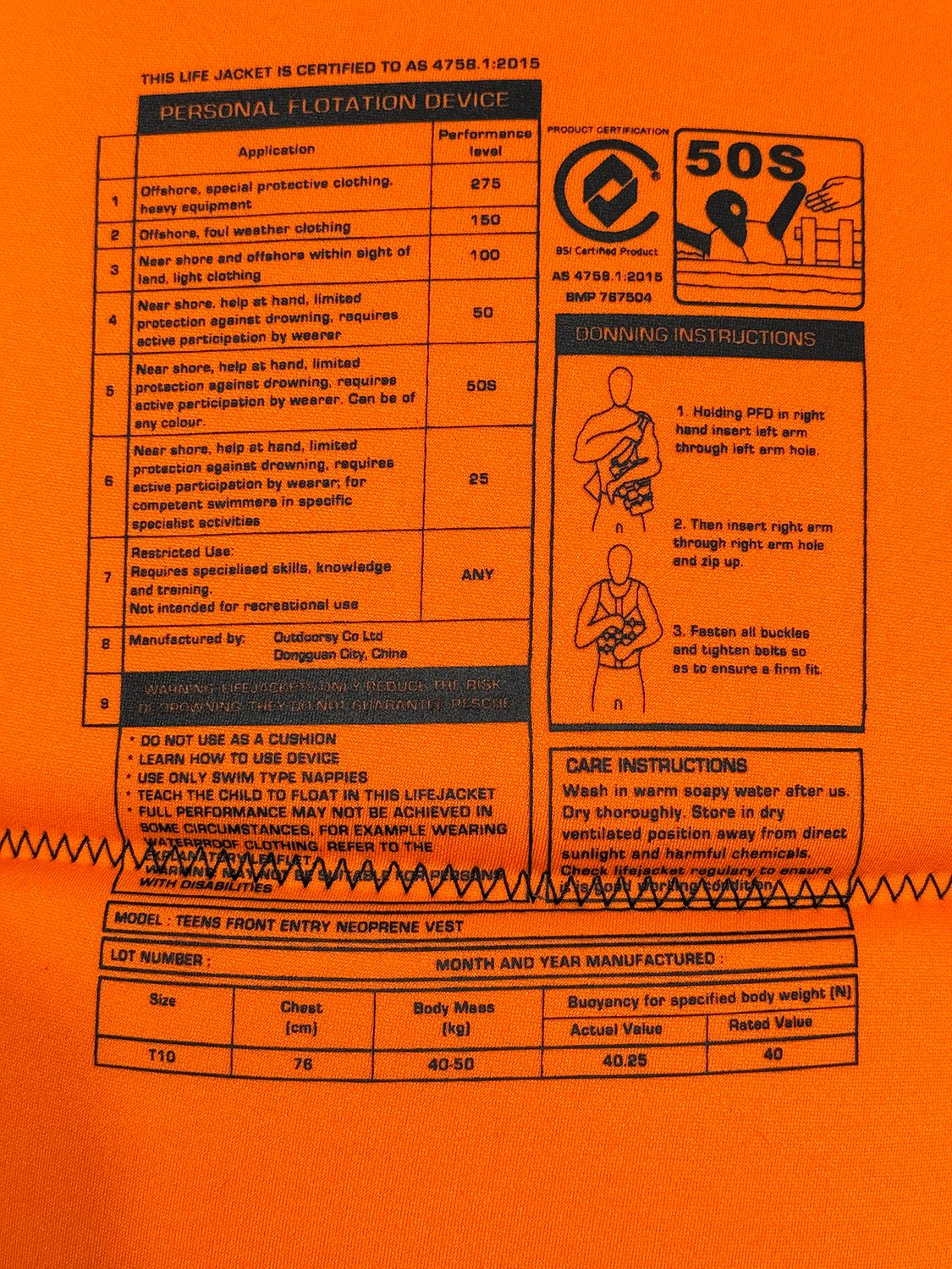 There is NO LOT NUMBER on the Australian Standards PFD/L50S stamp inside the vest, meaning this Vest is NOT APPROVED as a personal flotation device. So, we must work in the parameter that it may NOT be the same as an APPROVED Vest.