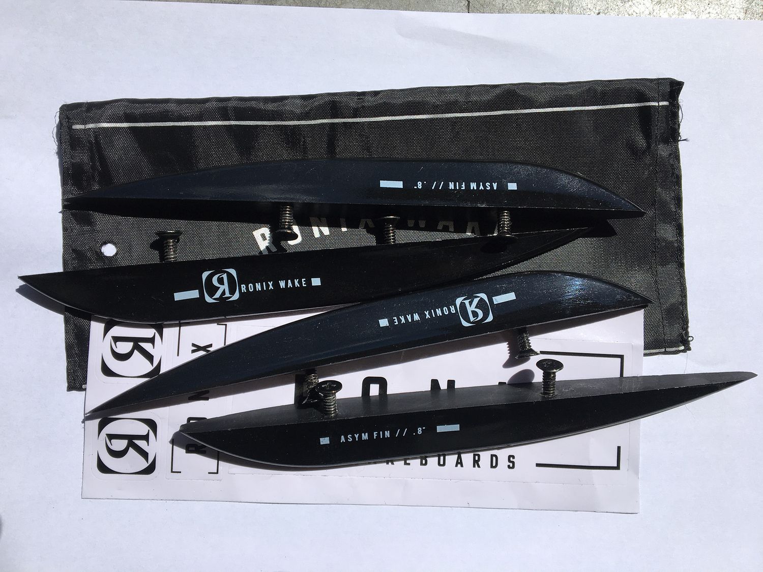 Ronix Asymmetric Wakeboard Fins X4 0.8 Inch, Black. New and never used with counter sunk (Ronix) screws. In bag with sticker pack.