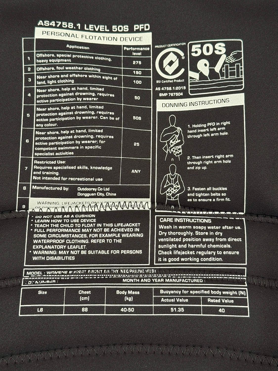 There is NO LOT NUMBER on the Australian Standards PFD/L50S stamp inside the vest, meaning this Vest is NOT APPROVED as a personal flotation device. So we must work in the parameter that it may NOT be the same as an APPROVED Vest.