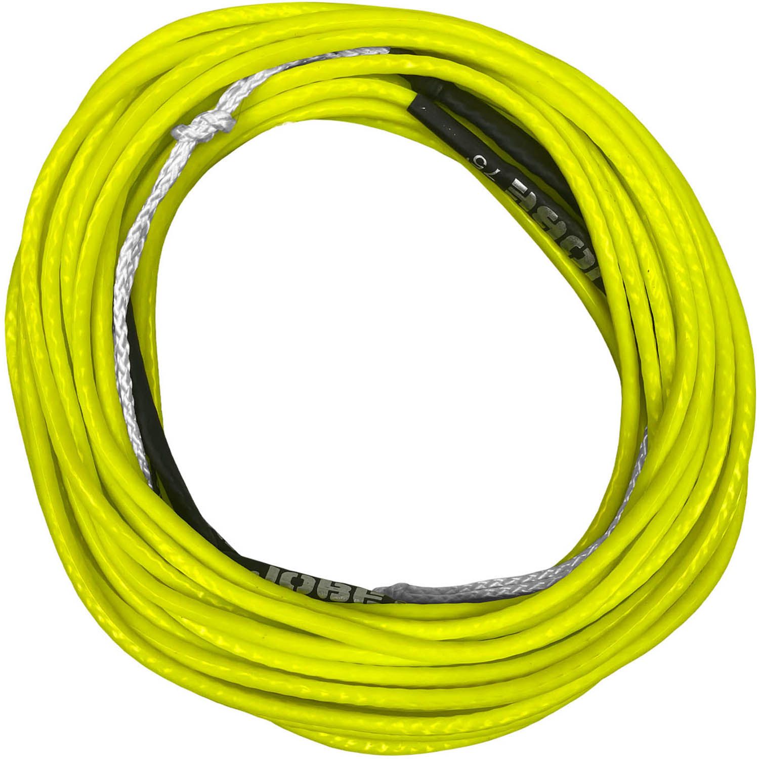 Wakeboard ropes are available in Poly E, Dyneema or Spectra constructions. Poly E is a low-stretch fibre that is forgiving, inexpensive and commonly used for water ski and tube ropes. Poly E ropes are suitable for beginners however may become problematic for intermediate and advanced riders due to its inherent stretch. Poly E ropes are typically available in maximum lengths of 65’ with a limited number of sections. In contrast, Dyneema and Spectra are no-stretch fibres that offer incredibly high breaking strengths and are covered with a silicone or plastic jacket for durability, waterproofing, floatation, and colour. They offer a significant performance increase over poly E ropes due to their lightweight, no-stretch characteristics. Dyneema and Spectra ropes are available in maximum lengths of 80’ with between 4 and 8 sections.